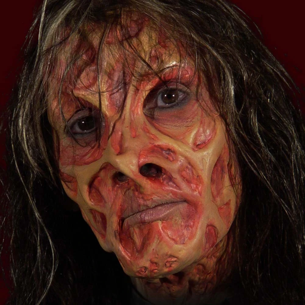 This scarred face is an extreme burn victim injury facial appliance that Freddy Krueger and Harvey Dent can both relate to. So much pain just wants you to turn evil. Can you blame them?