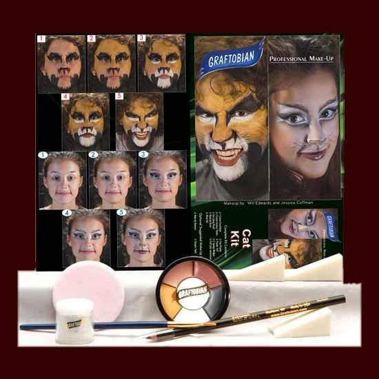 Graftobian’s boxed kit contains all the professional quality crème makeup and instructions needed to create a cat character makeup effect this Halloween. Each kit contains, a minimum of, 4-5 colors, Usually 1, 1/2 oz. Foundation color accompanied by 4, 1/8 oz. contouring or accent shades. These colors are creme based make-up, so, face powder and puff are included to be used to powder over the make-up to set it so it will not smear or rub off.