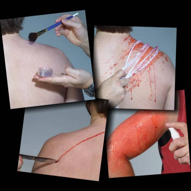 A water activated powder that when applied is invisible, but when sprayed with water looks like the result of a motor cycle accident. Drag a blunt object across powdered skin for a bloody cutting effect or slap with a wet cloth for a good flogging.