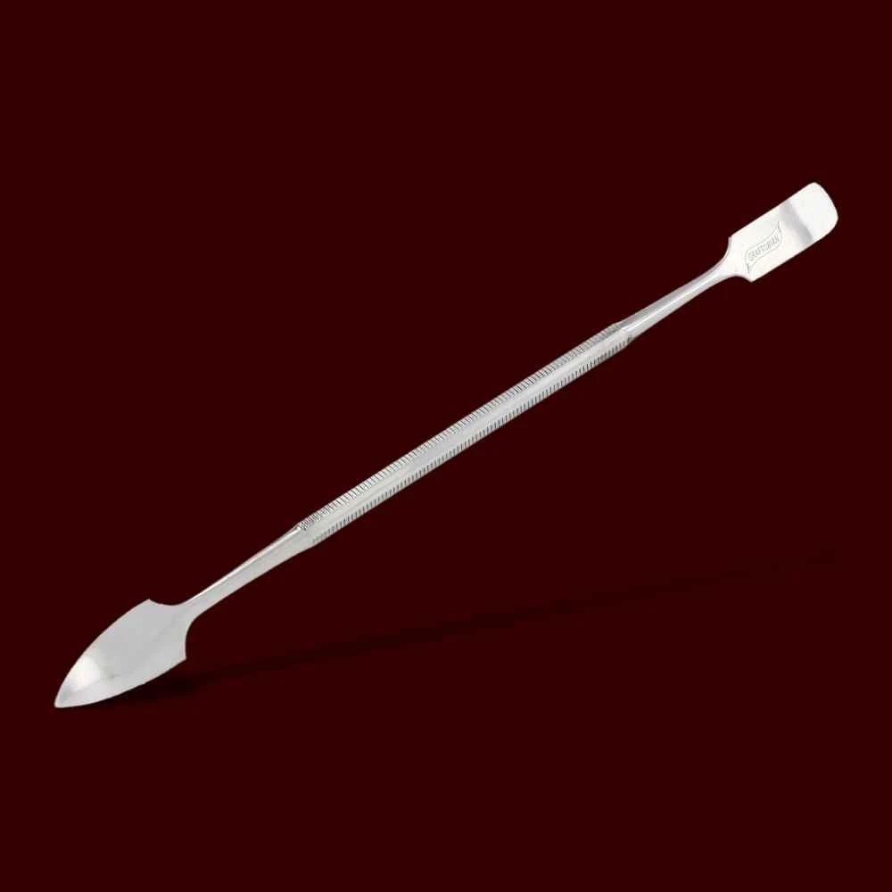 Shaped and slightly curved on each end. Ideal for scooping product out of containers and for performing various sculpting procedures in clay, wax, etc. One end is spade-shaped and slightly curved, the other is rectangular and slightly curved. This tool can be used to mix colors. Made of rigid metal and not flexible.