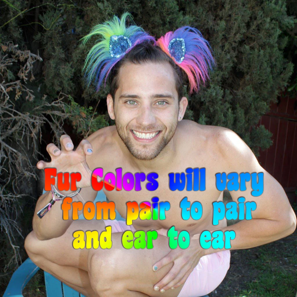 Neon and sparkle! These clip-on ears attach easily to hair or wig with pre-attached snap clips, and are very stable. Thick, soft fur in a rainbow of colors accented with shiny fabrics, sequins and sparkle highlights top off your bold look for festivals, concerts, club nights, Mardi Gras or just when you want to be extra colorful!  Handmade in the USA, these ears come in several color and fabric combinations to match any outfit or top off your favorite fluffy animal costume.Â