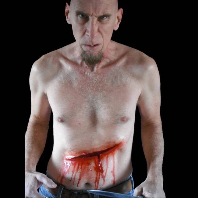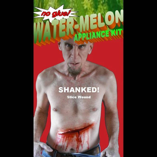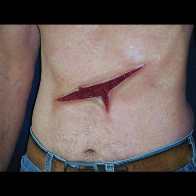 This is a 100% Latex free injury appliance that adheres to the skin with rubbing alcohol. No adhesive is required. This appliance is lightweight and depicts a large deep cut that might have been acquired by a knife or an unfortunate fall onto any number of sharp edged objects. Approx 9 inches long with 0.5 inch blending edge all the way around. Approx 2.5 inch wide at widest spot of wound. Also useful for moulage training.Â