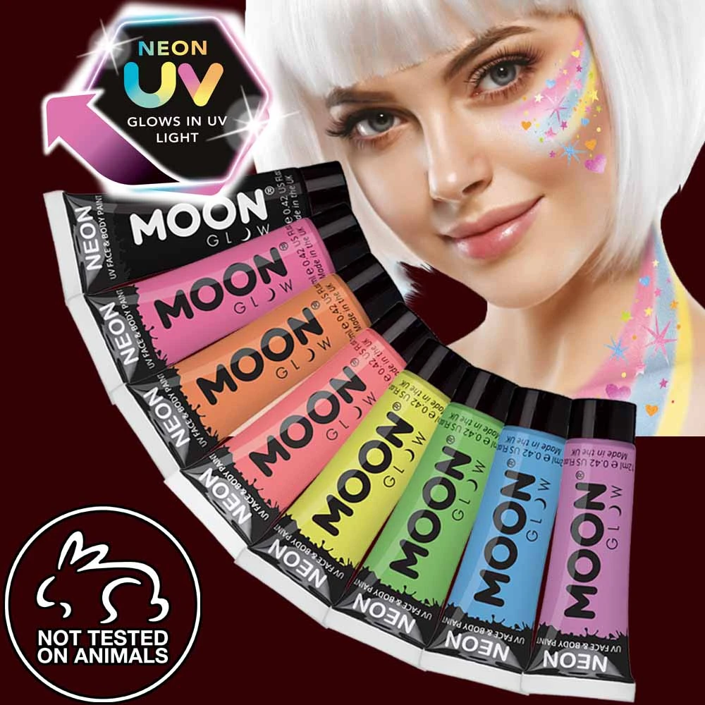 Moon UV makeup really pops under a black light, and shows intense neon colors in regular light. It is great for club makeup, party makeup or festival makeup. Excellent for 80’s parties and outfits. It also looks great for fantasy makeup looks and costumes like: