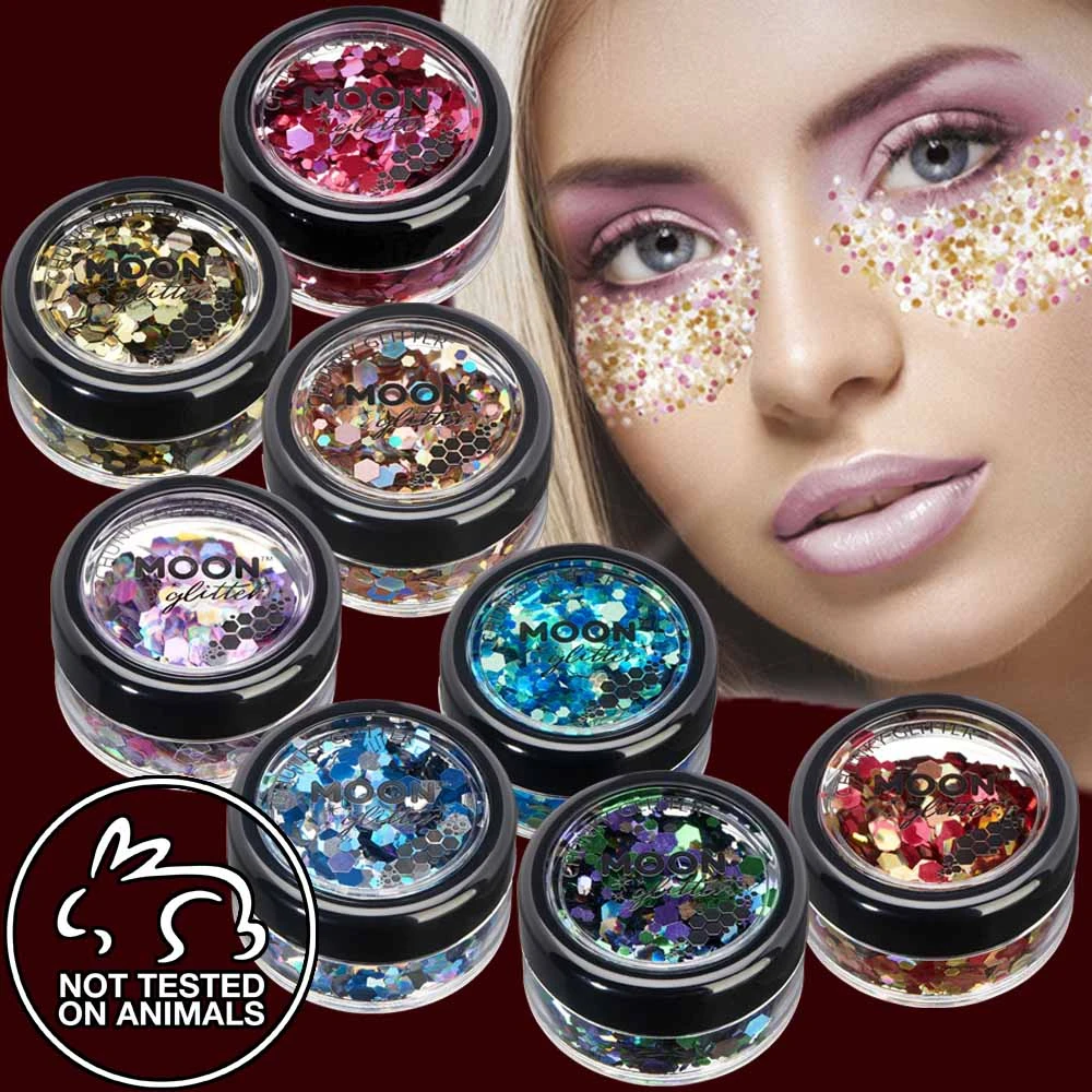Moon Glitter is made up of small cuts of cosmetic glitter which will add a sparkle to any occasion. Moon glitter is perfectly safe to apply to the face, hair and body and can be removed easily using just water. So whether you are going on a night out, or to a festival, be prepared to shimmer the night away!