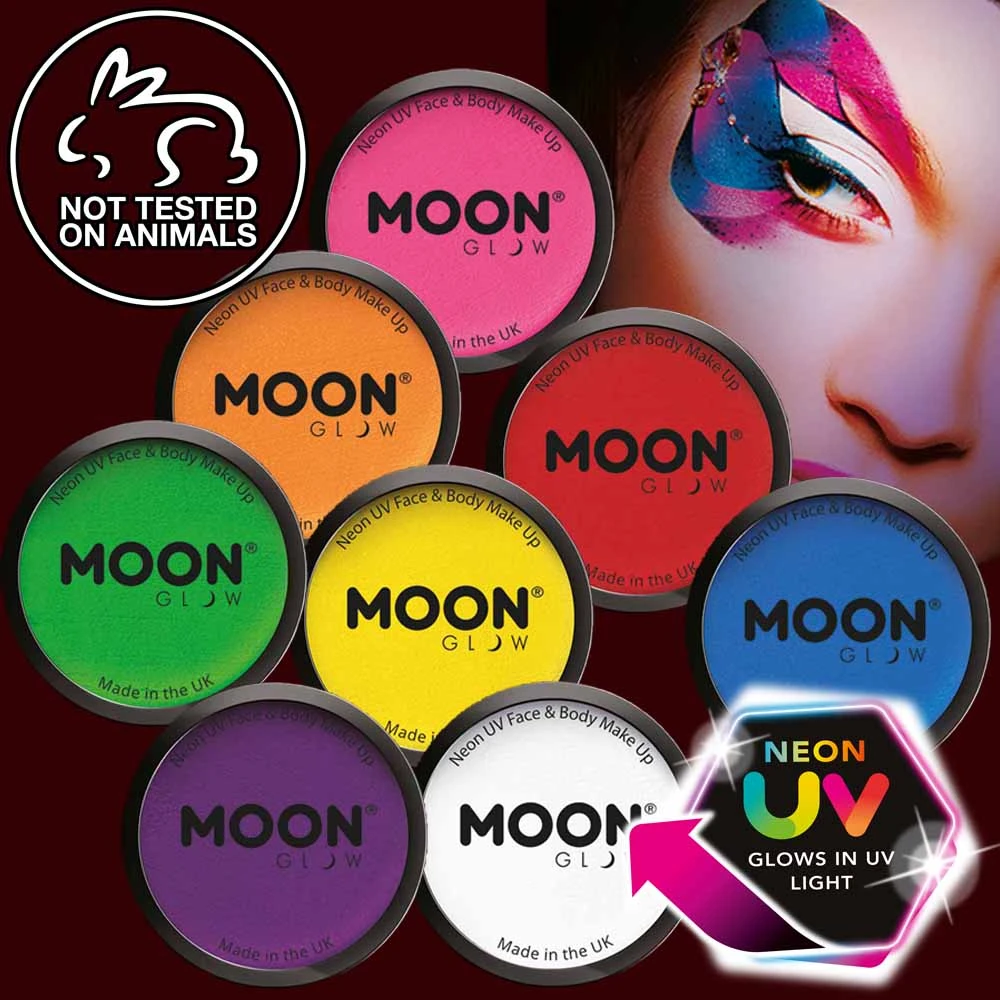 Moon UV makeup really pops under a black light, and shows intense neon colors in regular light. It is great for club makeup, party makeup or festival makeup. Excellent for 80’s parties and outfits. It also looks great for fantasy makeup looks and costumes like: