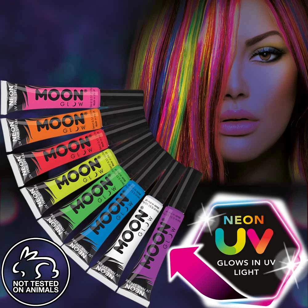 Moon UV makeup really pops under a black light, and shows intense neon colors in regular light. It is great for club makeup, party makeup or festival makeup. Excellent for 80’s parties and outfits. It also looks great for fantasy makeup looks and costumes like: