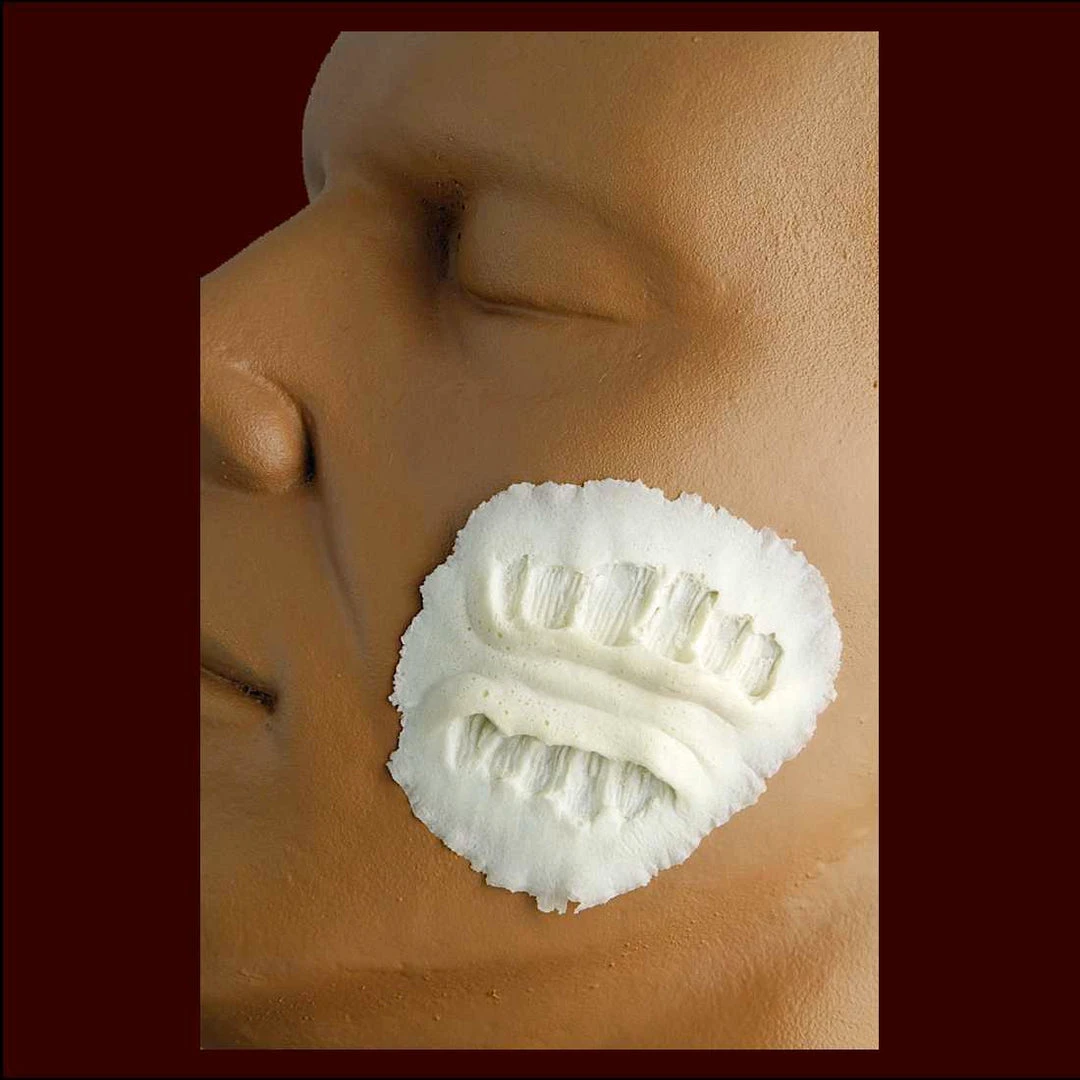A zombie bite FX wound prosthetic made of foam latex. This Rubberwear injury appliance measures 2.25 inches across. It’s an incredibly easy and realistic DIY makeup effect!