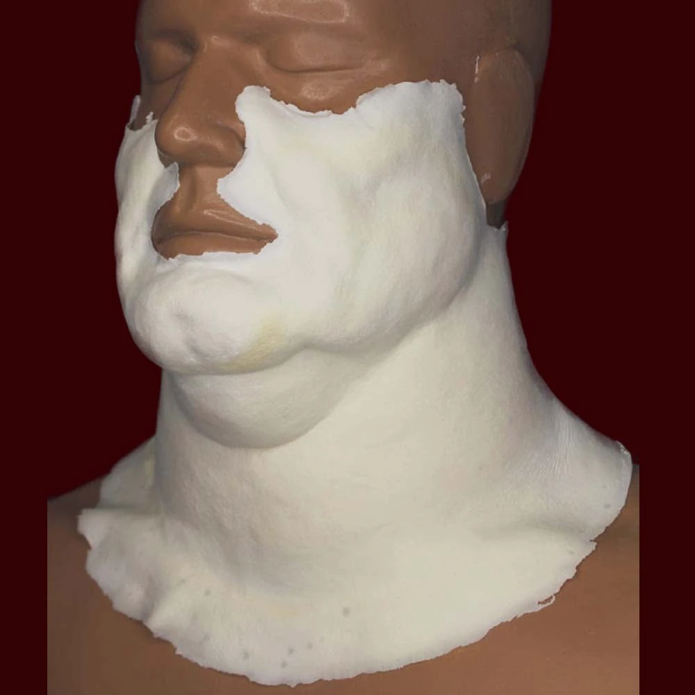 This prosthetic creates the look of a very full neck, chin, cheek and jowl line. Apply with cosmetic grade adhesive.
