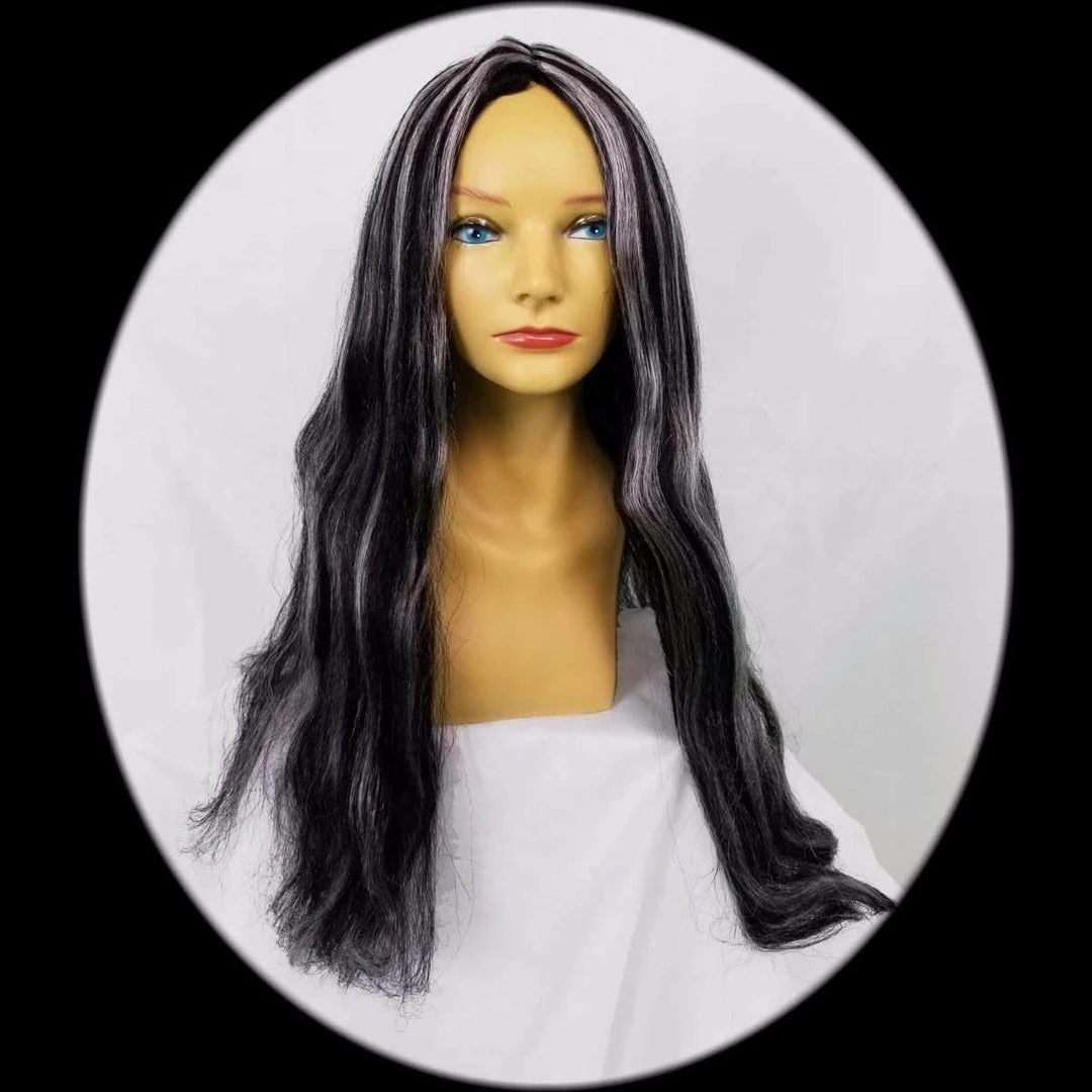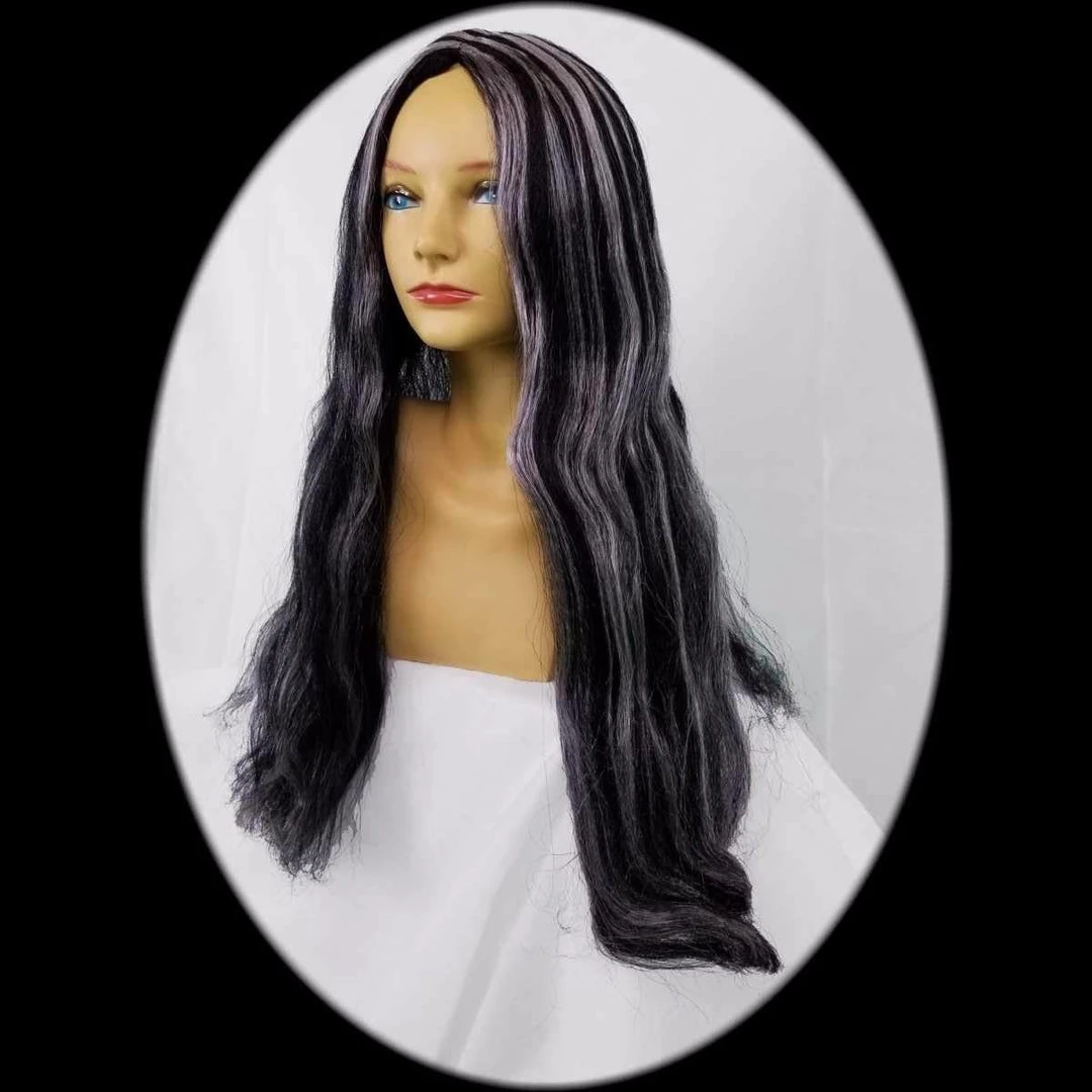 Black with light grey streaks 24 inch wig. Adult one size fits all. Â This wig is costume quality. Hand wash and air dry only.
