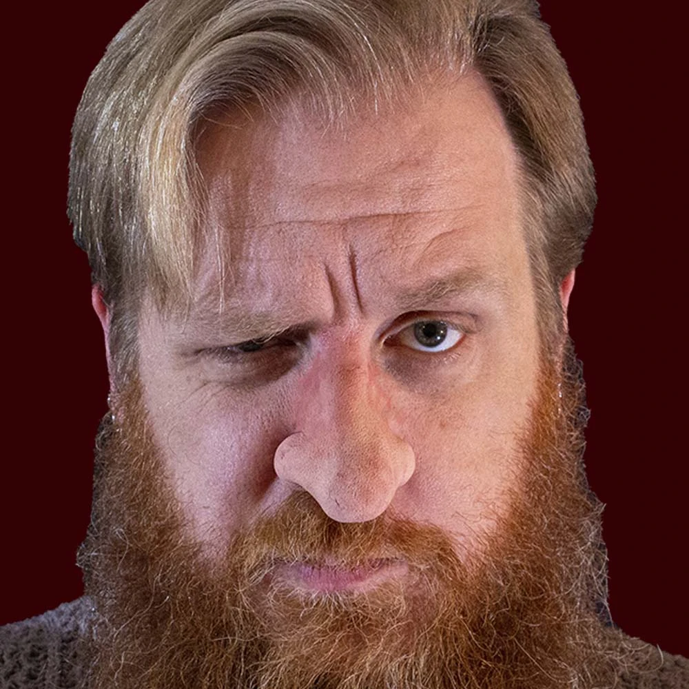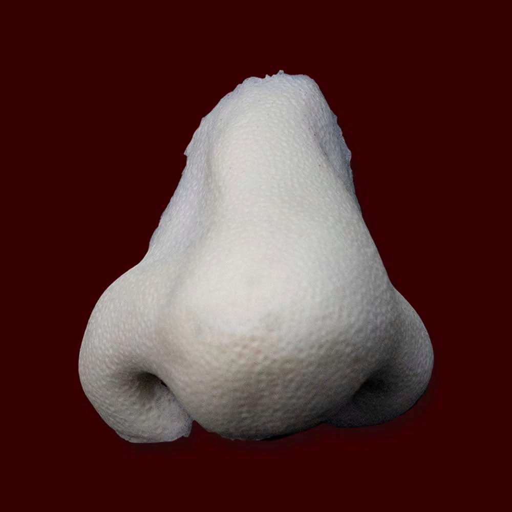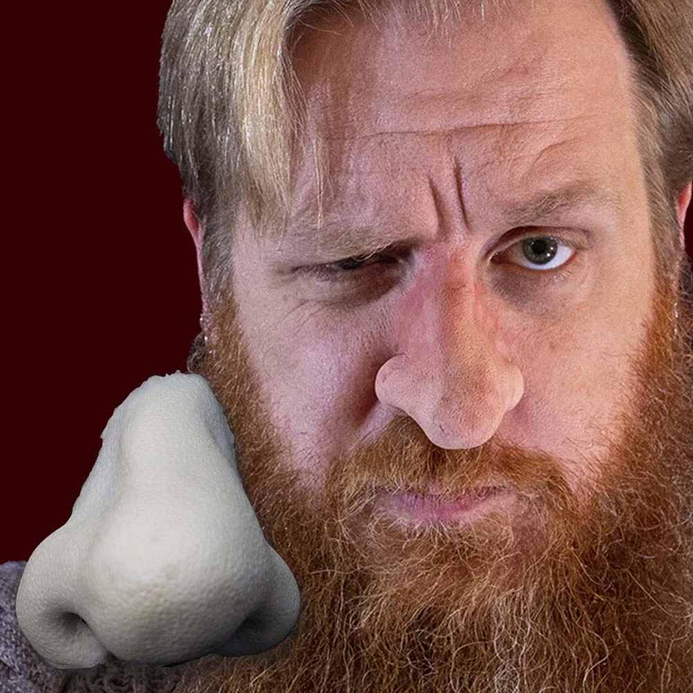 A bulbous costume nose with a subtle crook in the bridge. This wizard has seen some action. Was it a heated battle or a golfing accident?