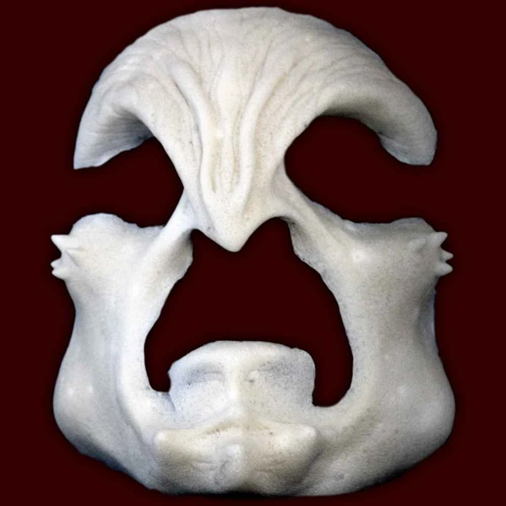 Skaarl is truely a uniquie piece with brow folds that lead to a point on the nose, small horn clusters on the cheeks and points on either side of the chin.