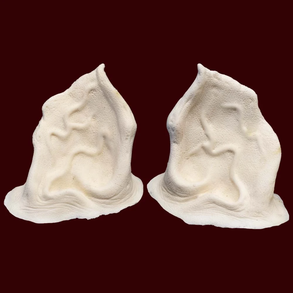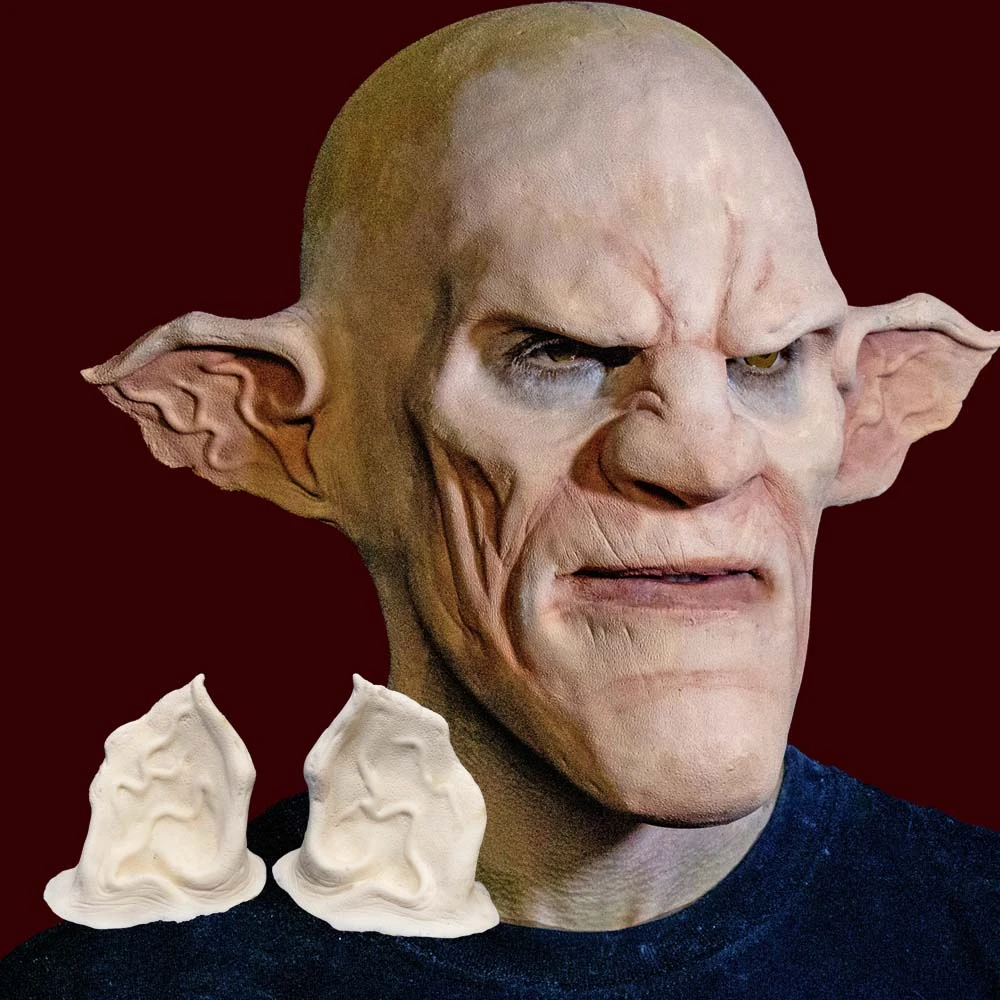 Large, veiny foam latex ears intended for use over a bald cap. They are designed to adhere to the side of your face, covering your ears.