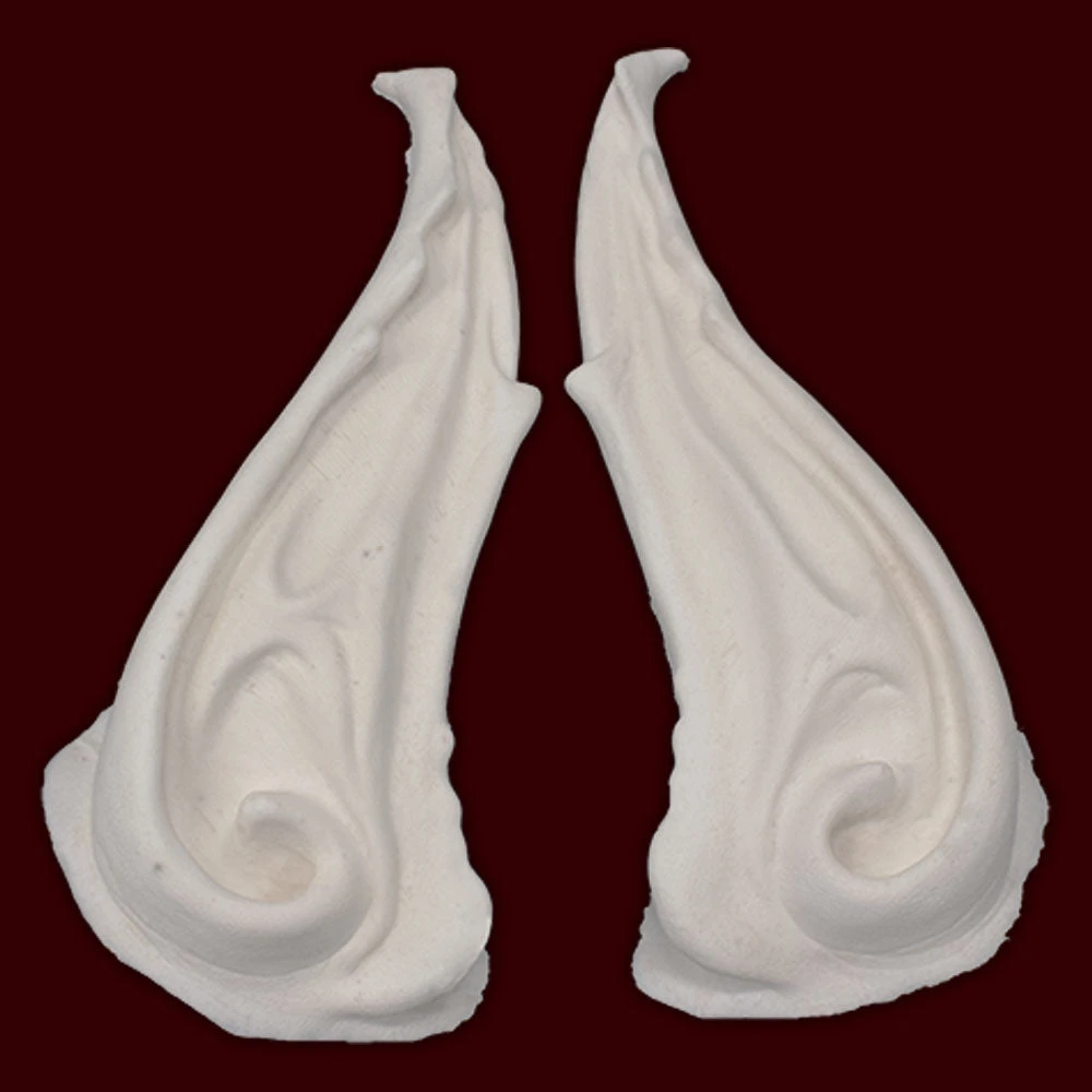 Large, long, ornate, curved foam latex costume ear appliances. Made to be worn with a bald cap as they adhere best on a flatter surface. With some careful and skillful alteration you may be able to use them without a bald cap but end results will vary.