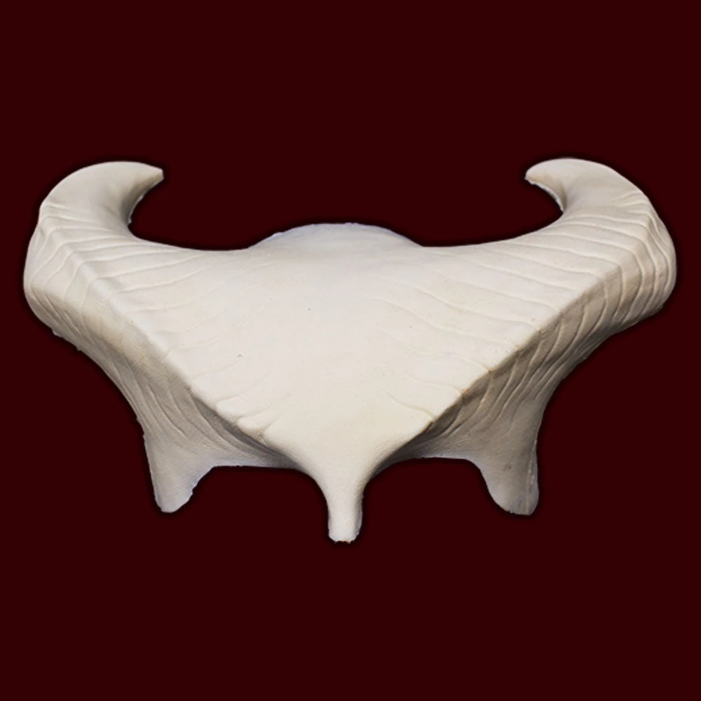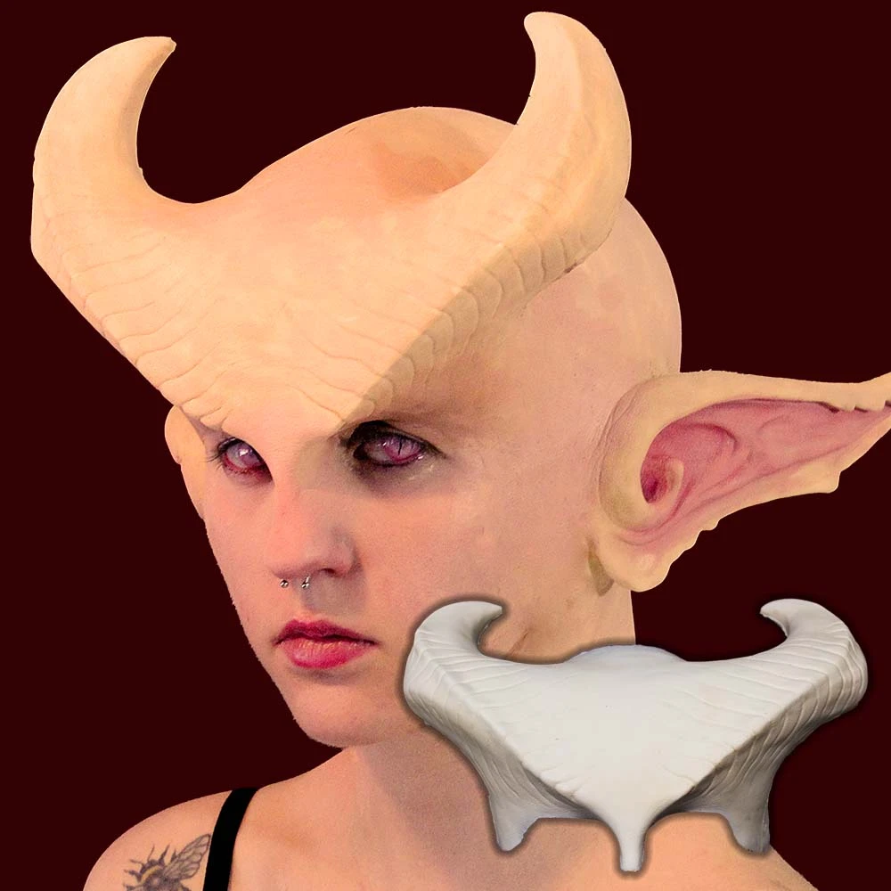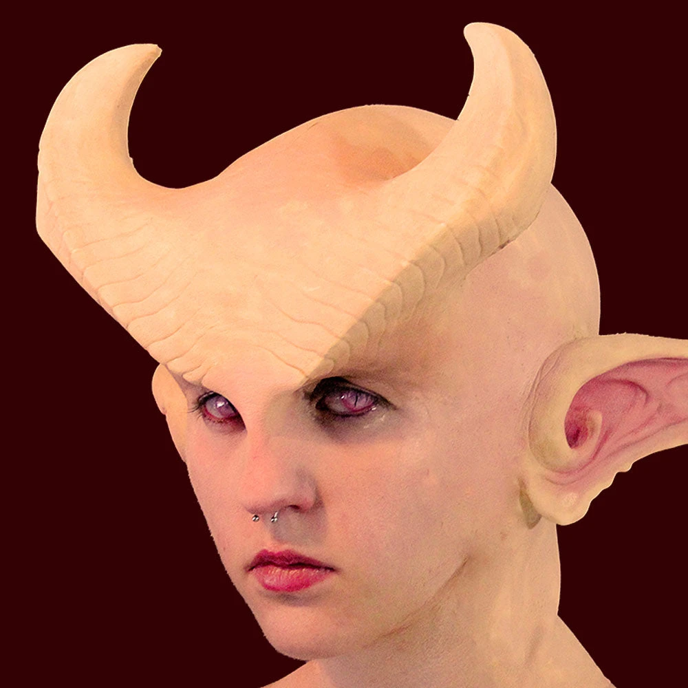 Ridged brow blends into horns that curve back over the head. Use of a bald cap is highly recommended as this piece will intrude into the hairline.