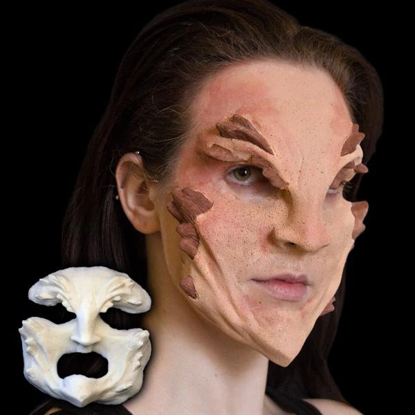 This full face appliance is versatile and features defined face ridges, pointed chin, sharp brow line and unique horns that resemble stone or tree bark. Great fantasy piece for either benevolent woodland or wicked demon creature.