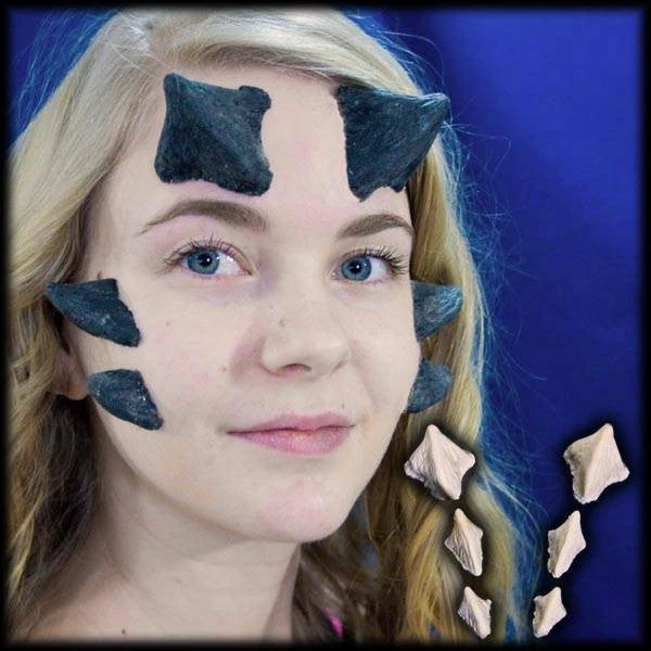 Two pairs of three spikes (6 horns total), you can pretty much stick them anywhere with no blending required. Just paint them up and glue them wherever you feel you’re lacking horns. They are made of foam latex and adhere directly to the skin using a cosmetic grade adhesive like Spirit Gum and can be colored with makeup.