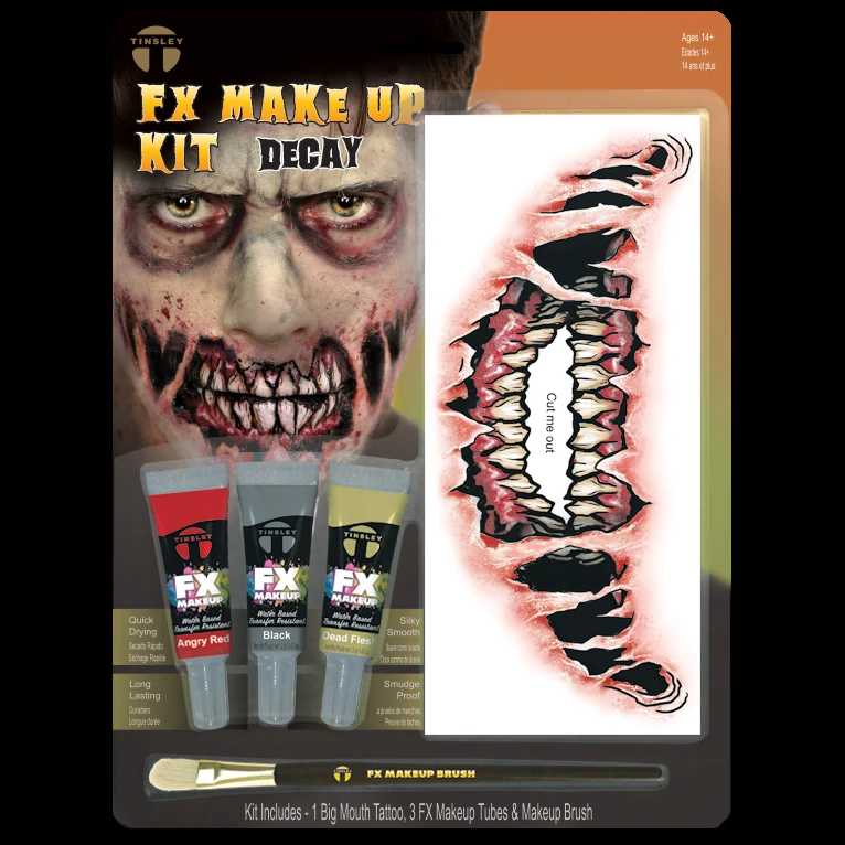 Contains 1 Big Mouth Tattoo, 3 FX makeup tubes and makeup brush