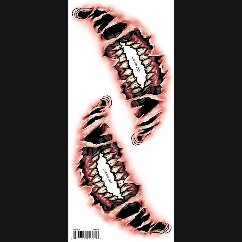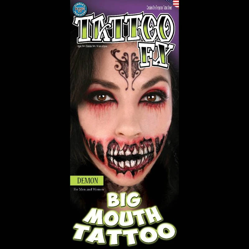 Oversized demon or zombie mouth temporary tattoos for your face! Get this look without using makeup! Includes two big mouth tattoos. They take minutes to apply and last all night. Easy to remove.