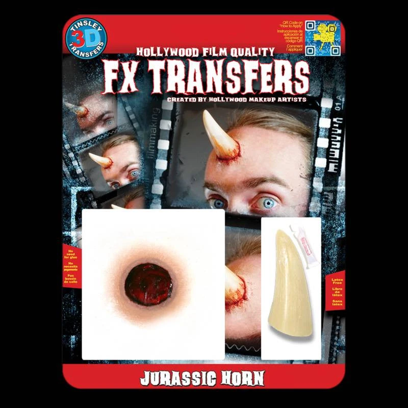 Large single horn with light flesh tone 3D transfer base. Includes adhesive for applying the horns to the 3D appliance. These 3D transfers apply with water and are latex free. They look extremely realistic and blend seamlessly into your skin. You can use any kind of makeup that is a creme, liquid, water or alcohol activated. Fake Blood on these 3D FX Transfers will help achieve those realistic looks. Don’t go to this years party with those hard to apply makeups that end up itching and falling off half way through the evening. Use the Tinsley Transfer 3D FX Transfer this year!