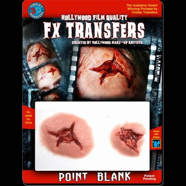 Deep wound set. 3D FX Transfers are the revolutionary prosthetic for your Halloween Costume or special event. No need for sticky glues anymore. These 3D transfers apply with water and are latex free. They look extremely realistic and blend seamlessly into your skin. You can use any kind of makeup that is a creme, liquid, water or alcohol activated. Fake Blood on these 3D FX Transfers will help achieve those realistic looks. Don’t go to this years party with those hard to apply makeups that end up itching and falling off half way through the evening. Use the Tinsley Transfer 3D FX Transfer this year!