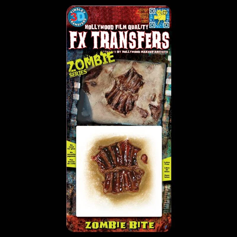 Zombie rotten flesh color deep torn flesh bite. Â 3D FX Transfers are the revolutionary prosthetic sfx for your Halloween Costume or special event. No need for sticky glues anymore. These 3D transfers apply with water and are latex free. They look extremely realistic and blend seamlessly into your skin. You can use any kind of makeup that is a creme, liquid, water or alcohol activated. Fake Blood on these 3D FX Transfers will help achieve those realistic looks. Don’t go to this years party with those hard to apply makeups that end up itching and falling off half way through the evening. Use the Tinsley Transfer 3D FX Transfer this year!
