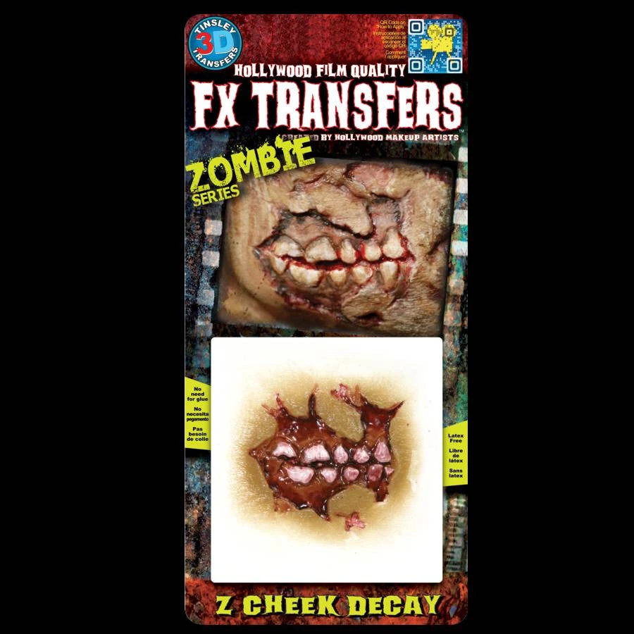 Zombie dead rotten flesh tone with exposed teeth through a torn cheek. 3D FX Transfers are the revolutionary prosthetic sfx for your Halloween Costume or special event. No need for sticky glues anymore. These 3D transfers apply with water and are latex free. They look extremely realistic and blend seamlessly into your skin. You can use any kind of makeup that is a creme, liquid, water or alcohol activated. Fake Blood on these 3D FX Transfers will help achieve those realistic looks. Don’t go to this years party with those hard to apply makeups that end up itching and falling off half way through the evening. Use the Tinsley Transfer 3D FX Transfer this year!