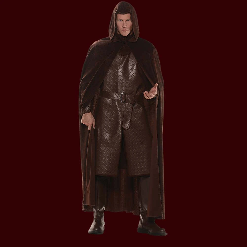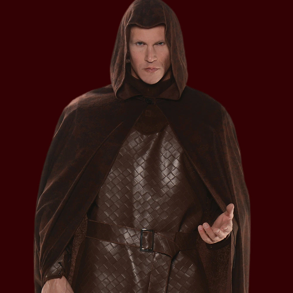 Brown hooded cape with attached hood in a faux leather print that ties in the front.