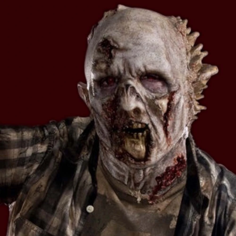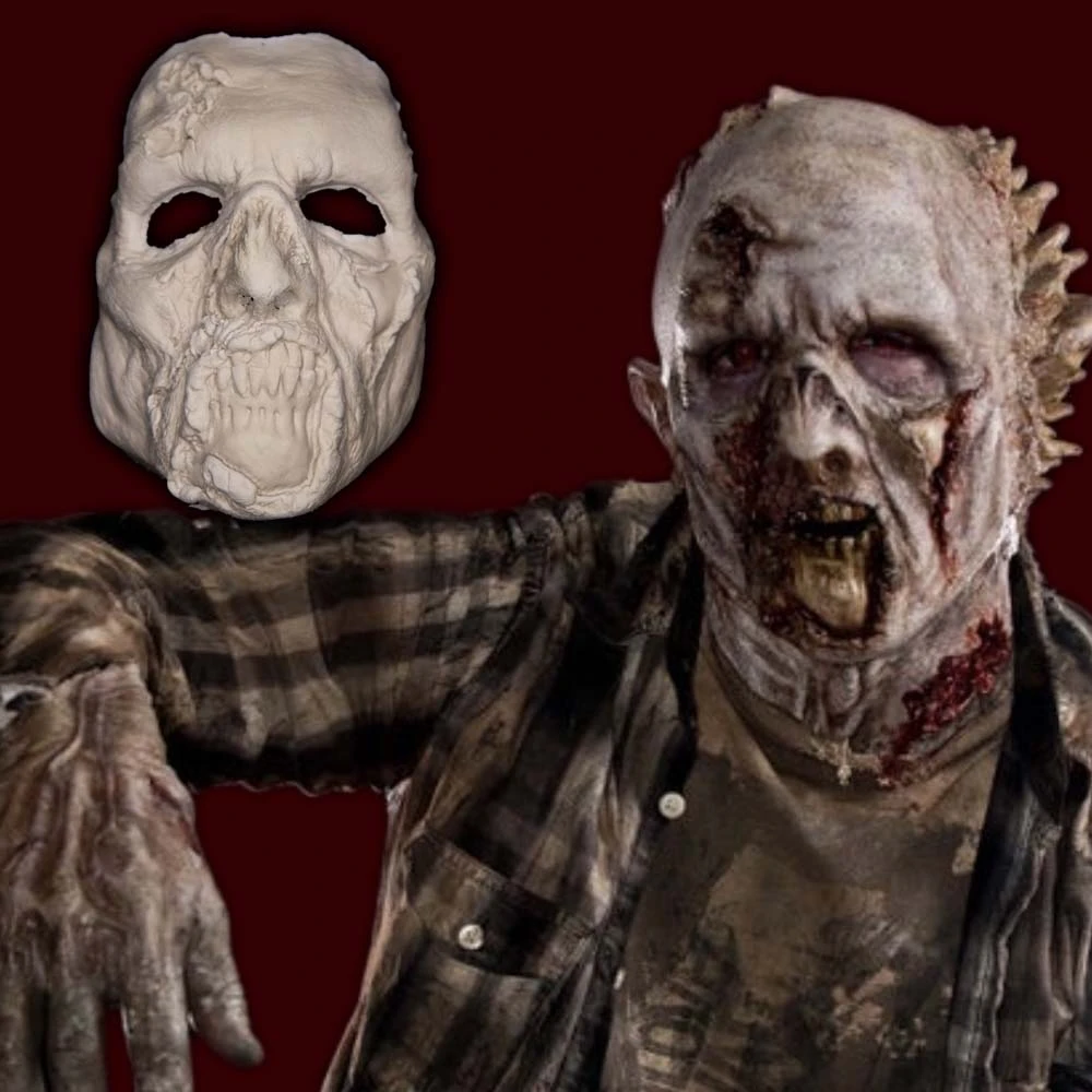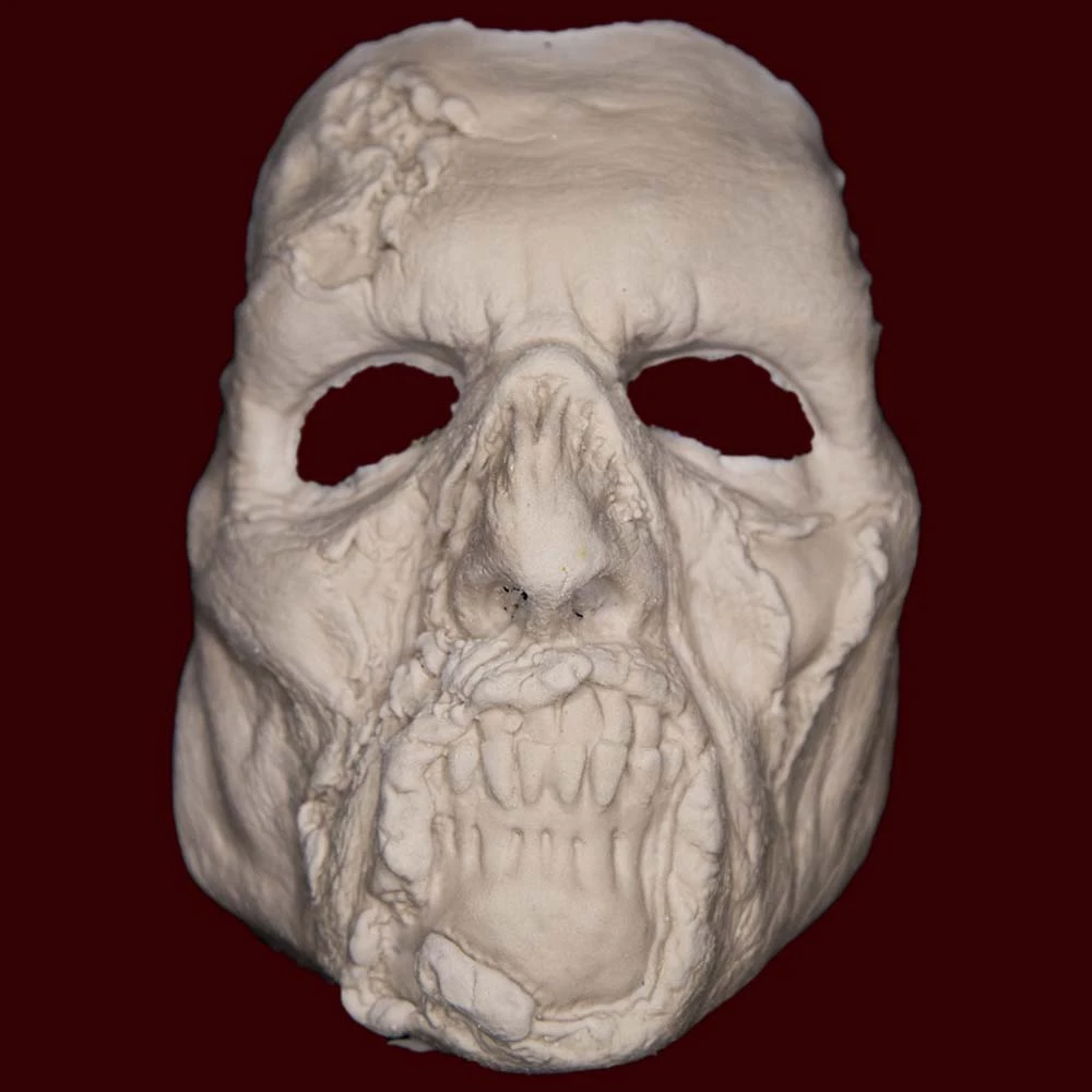 This foam latex mask has saggy skin and an exposed jawbone and nose. It has open wounds great for zombies and other undead.