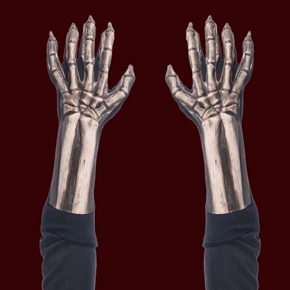 Painted to look like aged, exhumed bones, these Skeleton gloves have great dexterity in a light weight cotton glove. Natural latex uppers. Sized to fit up to a men’s large. Hand poured, painted and assembled in the US. Use a pair of these gloves to help round out any grim reaper skeleton costume with that final TOUCH!