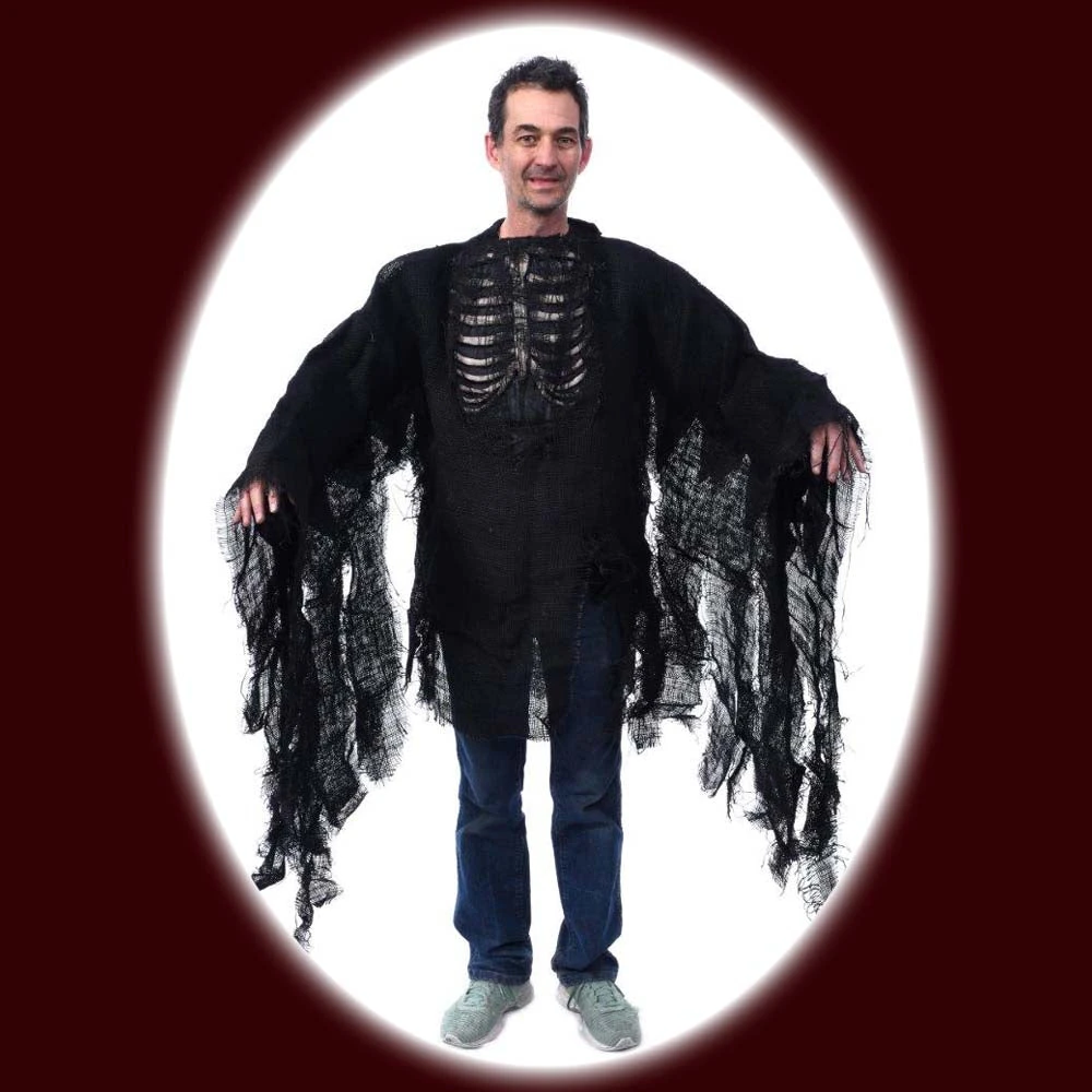 Latex bones attached to a Rotting Shirt. Velcro attachment and lightweight jute material make it a comfortable and east on and off costume piece!Â